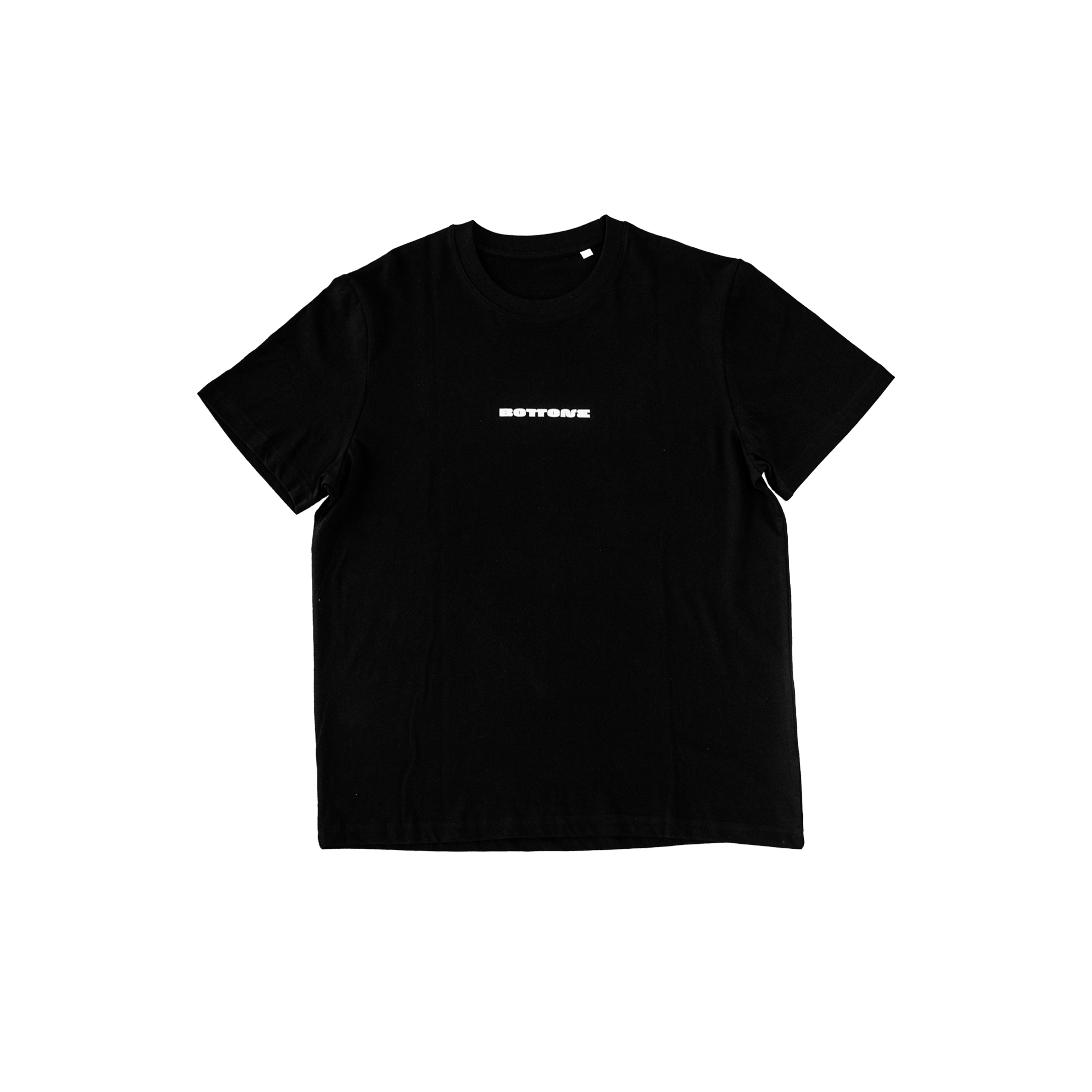 The t-shirt features crisp white screen printing, showcasing the Bottone logo on the front and an array of Bottone products on the back.